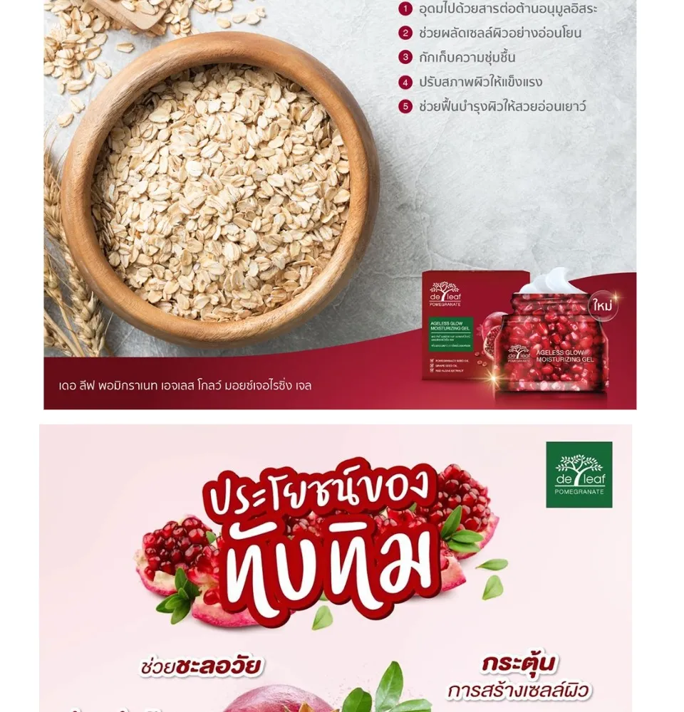 เดอ ลีฟ พอมิกราเนท เอจเลส โกลว์ มอยซ์เจอไรซิ่ง เจล "2นาที ให้ผิวเด้งอ่อนเยาว์ มีชีวิตชีวา"ด้วยนวัตกรรม Bounce Back เนื้อเจลเด้งคืนตัวได้เองภายใน 2 นาที เสมือนผิวที่ได้รับการบำรุง ก็จะเด้งคืนความอ่อนเยาว์ดังเดิม ด้วยคุณค่าสารสกัดจาก ทับทิม เมล็ดองุ่น และข้าวโอ๊ต สุดยอดสารสกัดจากเดอ ลีฟ พอมิกราเนท ช่วยคืนชีวิตให้ผิวกลับมาดูอ่อนเยาว์อีกครั้ง  เดอ ลีฟ พอมิกราเนท เอจเลสโกลว์ มอยส์เจอร์ไรซิ่ง เจล คืนชีวิตให้ผิวดูอ่อนเยาว์...มีชีวิตชีวา ด้วย 3 สุดยอดสารสกัด จาก เดอ ลีฟ